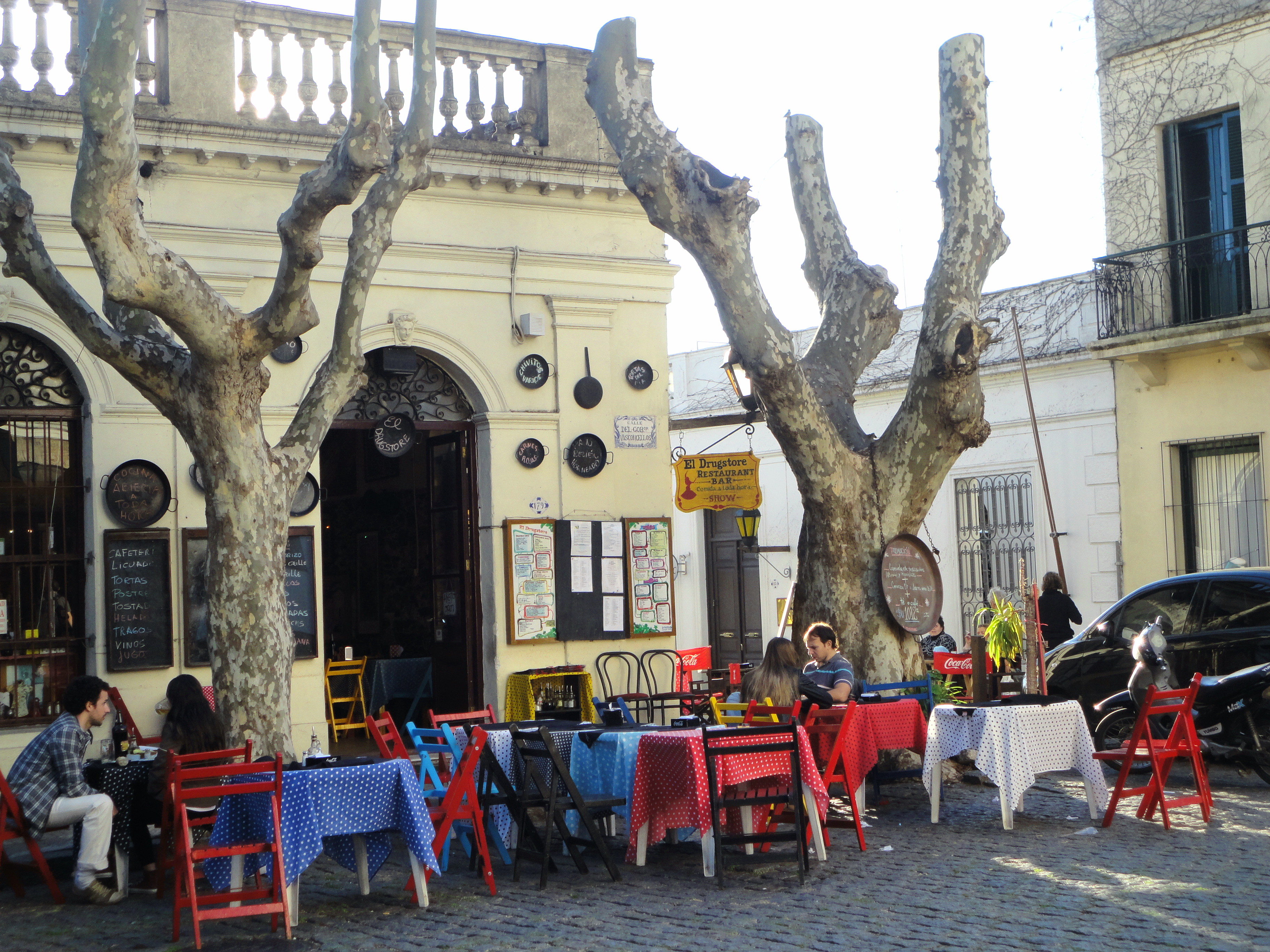 Seguindo na direção do porto náutico, ao norte, chega-se logo ao Drugstore. Com decoração colorida e moderninha, o restaurante fica em uma praça repleta de lindos plátanos e de frente para a Basílica do Santíssimo Sacramento — esta sim, uma herança da colonização portuguesa, do início do século XIX. Ao lado está o sítio arqueológico da Casa do Governador, residência portuguesa destruída pelos espanhóis em 1777. O Drugstore tem cozinha aberta e cardápio extenso, mas é possível pedir apenas uma porção de queijo. São muitos os lugares aprazíveis para uma refeição completa ou simplesmente tomar uma taça de vinho ou uma cerveja local, como a Patricia. Apenas certifique-se antes sobre a forma de pagamento. Alguns restaurantes só aceitam cartões de crédito a partir de determinado valor. A maioria das contas é em pesos uruguaios, pesos argentinos e dólares.