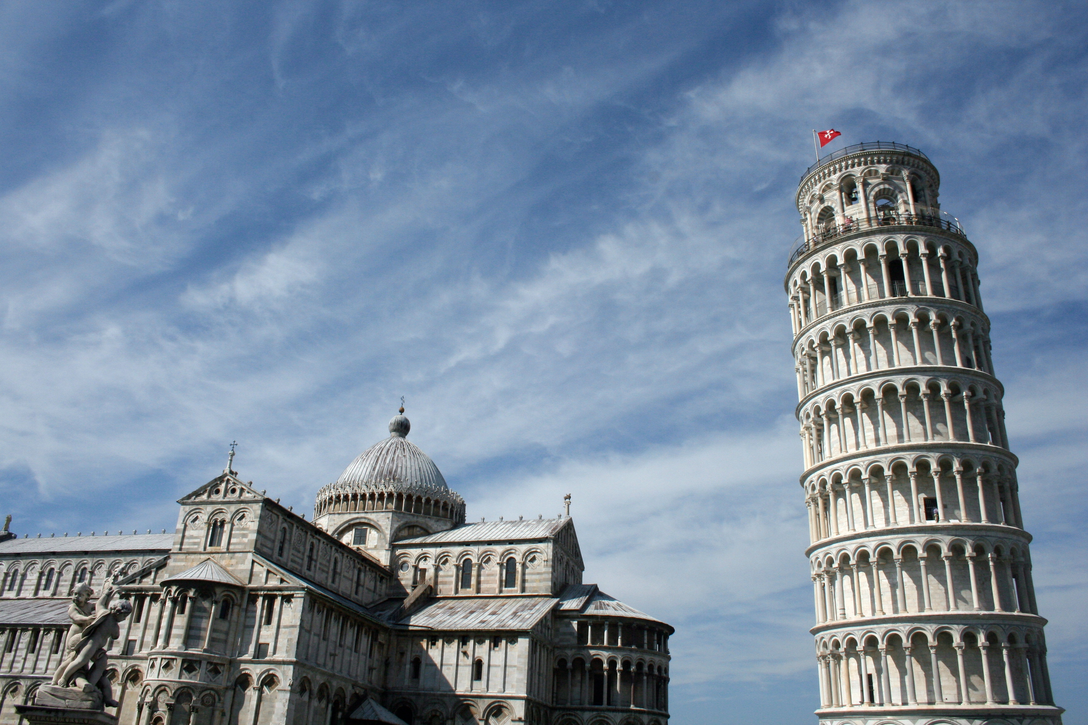 A torre de mármore hoje imaculadamente branco, completada em meados do século XIV (sua construção começara dois séculos antes), é o ponto alto e torto de uma visita a Pisa. Com 56 metros de altura, ela se destaca em meio às telhas vermelhas dos prédios mais baixos. Das suas 180 colunas, apenas 33 são de mármore original, de San Giuliano, nos arredores da cidade. Nas outras o mármore foi trocado pelo de Carrara, ainda na Toscana, mais ao norte, no processo de restauração que começou no ano 2000, com recursos da União Europeia. Mesmo que não suba até o topo, chegue perto para admirar o incrível erro arquitetônico e ver a inclinação das fundações a partir do solo.